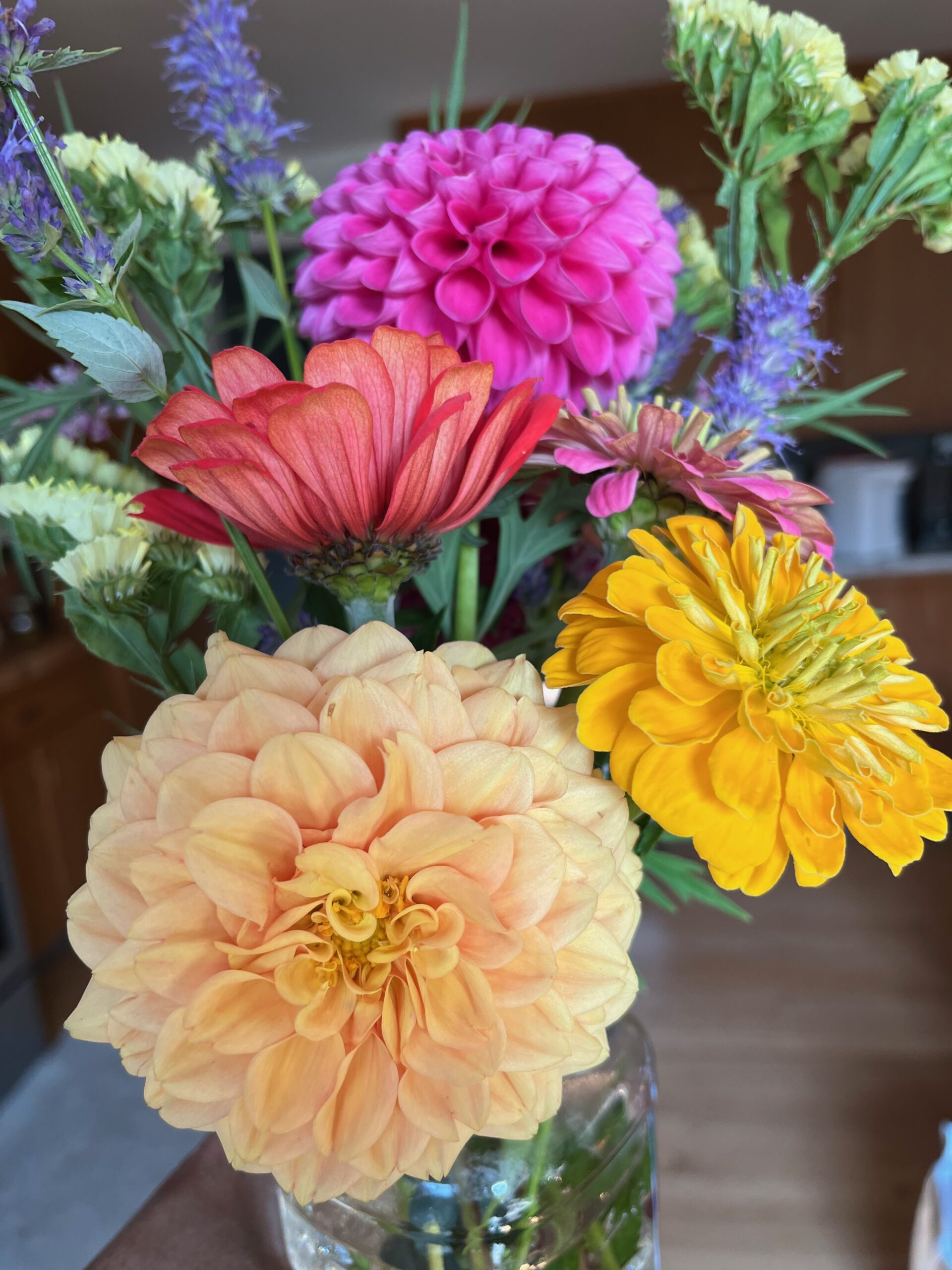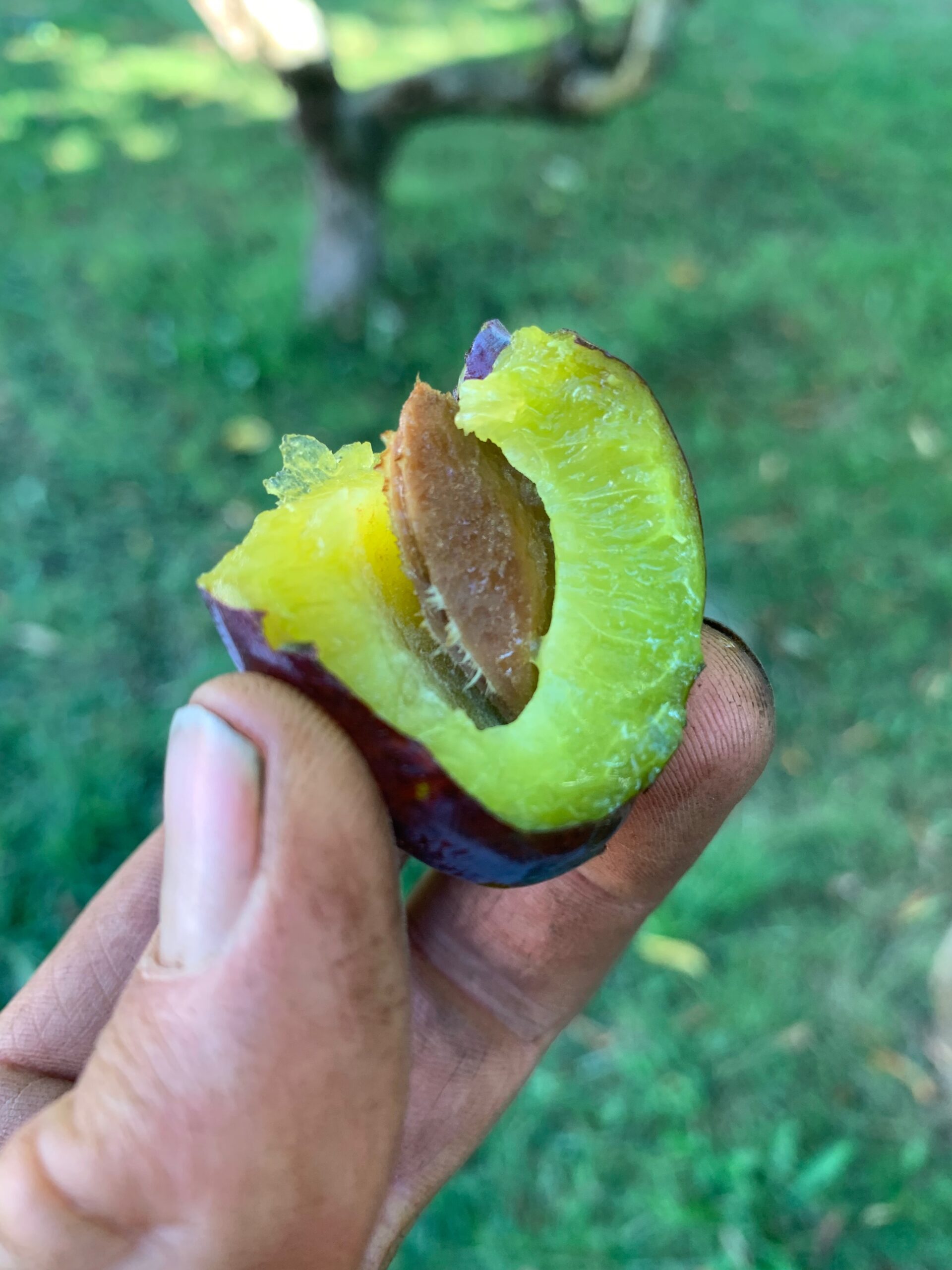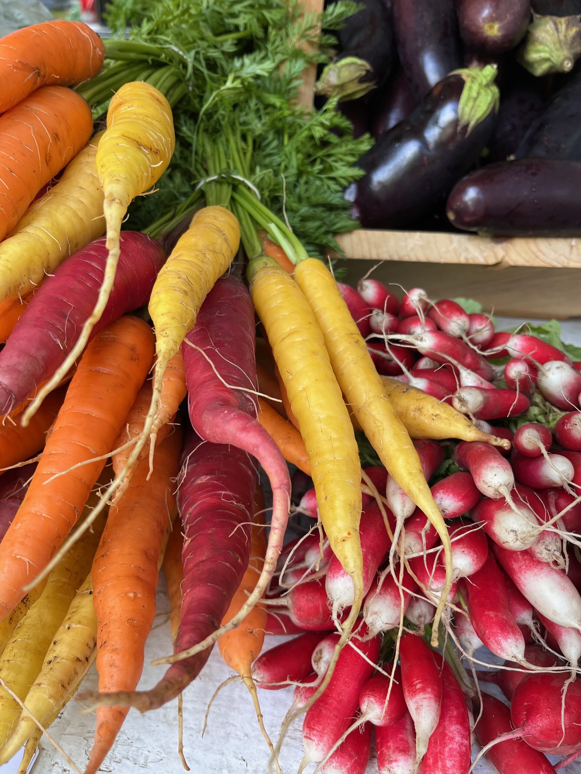 We grow dozens of varieties of vegetables, herbs, and fruits such as carrots, tomatoes, garlic, many greens and salad mixes, apples, pears and more.